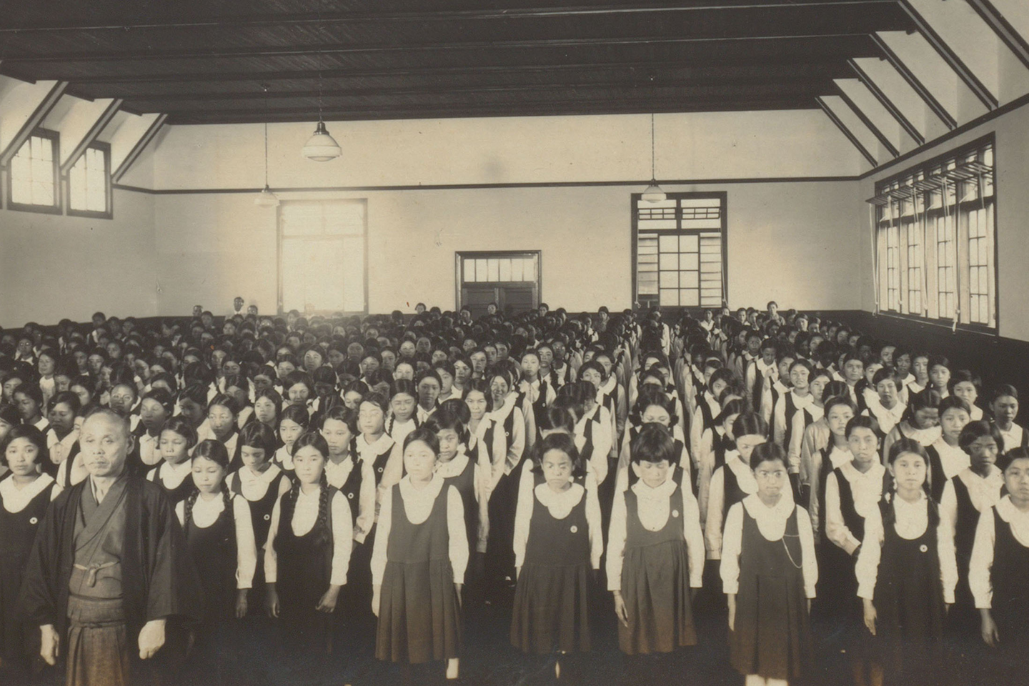 1930(昭和5)年に校舎裏の麦畑を取り入れて講堂の新設に着手。夏休み中、教師も生徒も代わる代わる出校し、床をおからで磨き上げた。この講堂では、川村理助先生の精進道提唱10周年記念講習会が催され、その折、生徒は明け方から講堂の雑巾掛けや学校周辺の清掃に取り組んだ。朝清掃は、精進道の実践として調布学園の伝統となり、現在も続けられている。