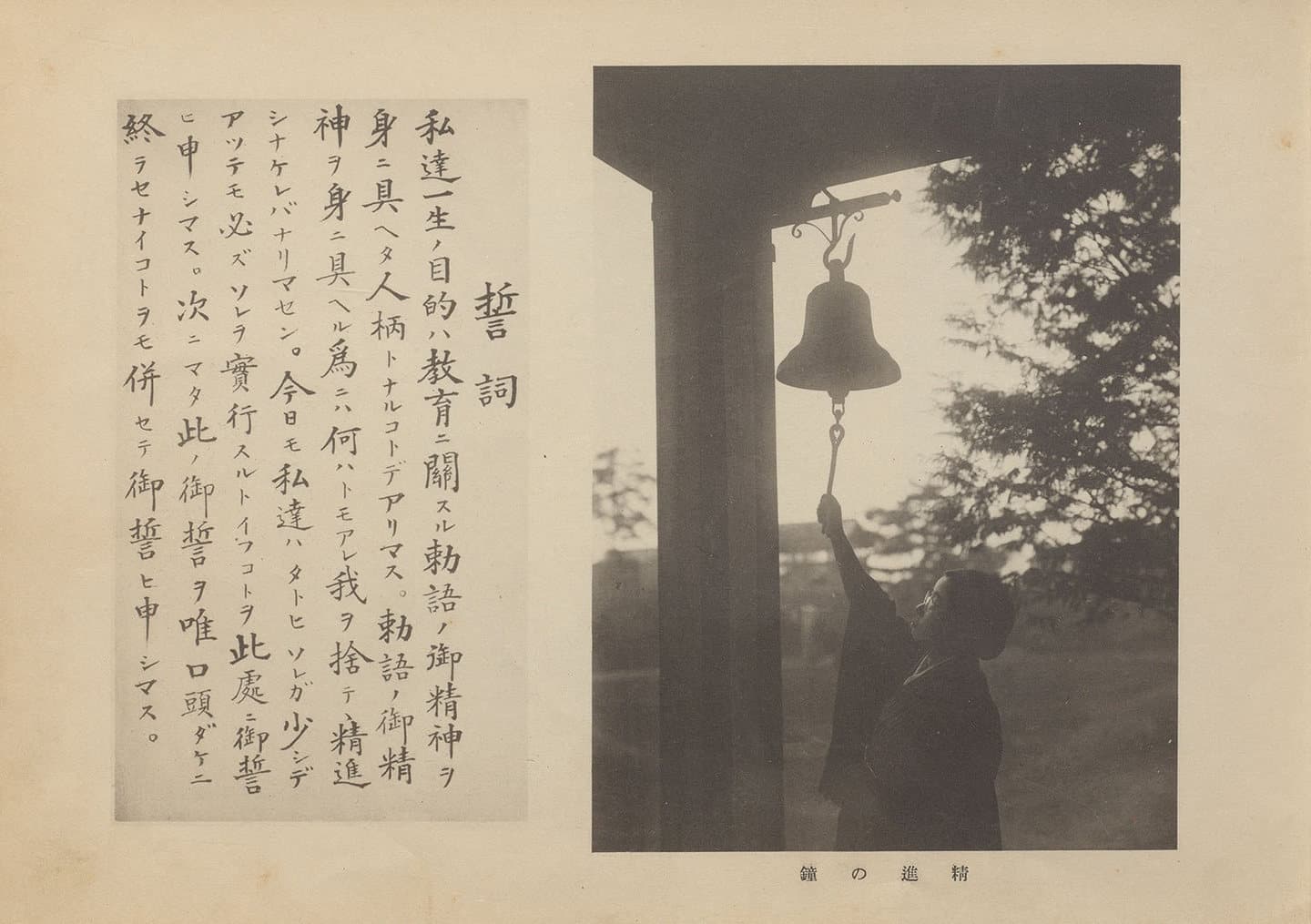 創立当時の副校長細川武子先生は、川村理助先生から新しい学校の教育の理念を聞いた。この学園を「精進の道」の普及の原点としたい。その一つの方法として、学校に「精進の鐘」を設ける。朝夕に鐘の音を聞いて精進を誓い、精進をかえりみ、明日の発憤を決意する。1日の労働の後に感謝の祈りを捧げるミレーの名画「晩鐘」のように。1930(昭和5)年5月、細川武子先生が「精進の鐘」建立の発願を発表し、1934(昭和9)年1月に完成。2月11日に撞初式が行われた。